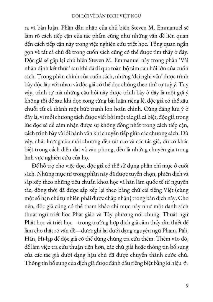 Đây là một tài liệu tham khảo rất có giá trị vì so sánh cách tiếp cận của Phật giáo và Tây phương cho những ‘câu hỏi lớn của triết học.’ Mỗi người, bất luận có quan tâm đến triết học hay không, có lẽ cũng sẽ đều cảm nhận được trọng lượng và ý nghĩa của những câu hỏi lớn này khi chúng được nhắc đến. Dù những vấn đề được đặt ra đã rất rõ ràng và dễ hiểu, song để giải đáp được chúng lại đòi hỏi ở độc giả một nền tảng kiến thức và hệ thống phương pháp tư duy khoa học vững chắc. Cuốn sách này, tuy đề cập đến những chủ đề rất hấp dẫn và có vẻ đại chúng, vẫn là một công trình khoa học được đóng góp bởi nhiều chuyên gia học giả trong các phân nhánh khác nhau của triết học Phật giáo và Tây phương. Khác với những cuốn sách dẫn nhập hay nhập môn, những tư tưởng và khái niệm triết học không chỉ đơn thuần được giới thiệu và giải thích, mà sẽ được áp dụng và phát triển một cách đa dạng và tinh vi để giải quyết những vấn đề hóc búa được đặt ra.
