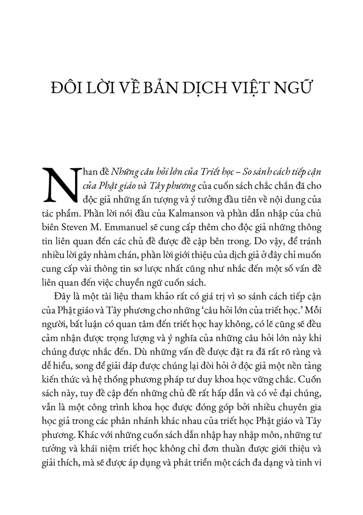 NHỮNG CÂU HỎI LỚN CỦA TRIẾT HỌC - ĐÁP ÁN CHO MỘT CUỘC SỐNG TRỌN VẸN Trong suốt dòng lịch sử của triết học, có những câu hỏi lớn luôn xuất hiện lặp đi lặp lại: Làm thế nào để hạnh phúc và sống một cuộc đời tốt đẹp? Giới hạn của tri thức là gì? Bản chất cuối cùng của thực tại ra sao? Ý thức hình thành thế nào? Quan hệ giữa nhân quả và ý chí tự do, hay những điều kiện nào tạo nên một xã hội công bằng và thịnh vượng? Tất cả đều là những vấn đề xuyên suốt bao thế kỷ, được các nhà tư tưởng ở nhiều nền văn hóa không ngừng tìm lời giải. Trong cuốn sách này, các vấn đề thường sẽ tập trung vào những nhân vật và văn bản quan trọng của truyền thống Phật giáo, qua đó giúp mở rộng và làm phong phú thêm tư duy của chúng ta về các câu hỏi muôn thuở ấy. Cách tiếp cận so sánh và giao thoa văn hóa cho thấy giá trị của những giải pháp thay thế trong triết học, đồng thời hé lộ những câu hỏi và câu trả lời mới mẻ, bất ngờ. Nhìn từ góc độ Phật giáo, ta được nhắc nhở rằng mục tiêu của triết học không chỉ là hiểu thế giới, mà còn là học cách sống trong đó. Bằng những so sánh gợi mở và sinh động giữa tư tưởng Phật giáo và triết học phương Tây, “Những câu hỏi lớn của Triết học” thách thức tư duy của chúng ta ở tầng sâu xa nhất, đồng thời bổ sung thêm những công cụ khái niệm, phương pháp và góc nhìn mới. Tất cả nhằm hướng đến lý tưởng cao cả: mưu cầu một cuộc sống hạnh phúc, tốt đẹp và trọn vẹn hơn. Nguồn: Columbia University Press |
