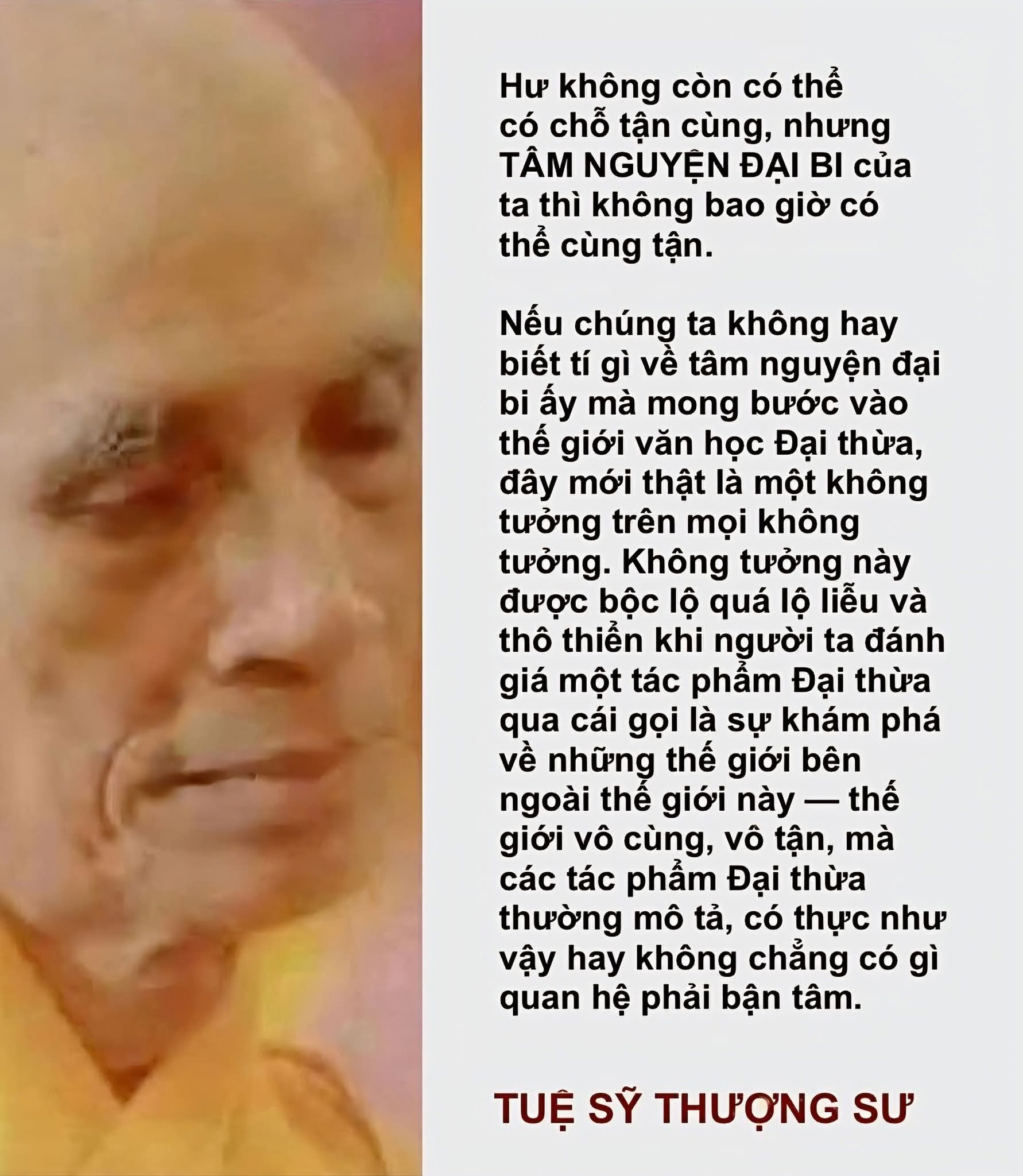 Bởi vậy, hương vị của Chánh pháp, như thầy Tuệ Sỹ nói, vẫn là hương vị cô liêu của sự sống. Cô liêu không phải vì thiếu vắng hơi thở nhân sinh, mà chính từ nơi cô liêu ấy, Đại bi tâm mới có thể sinh khởi (không phải như một cảm xúc đạo đức, mà như một tất yếu hiện sinh)